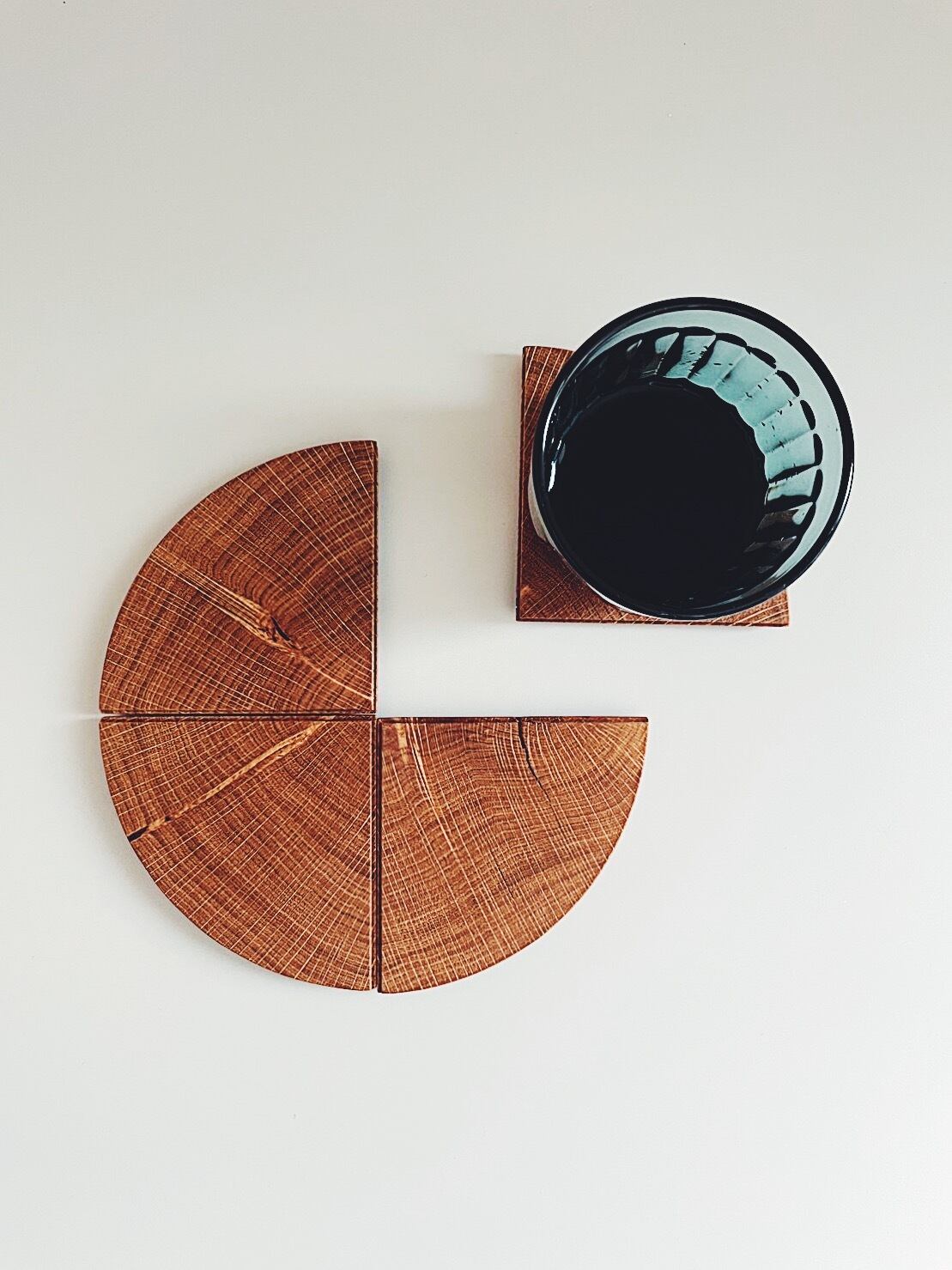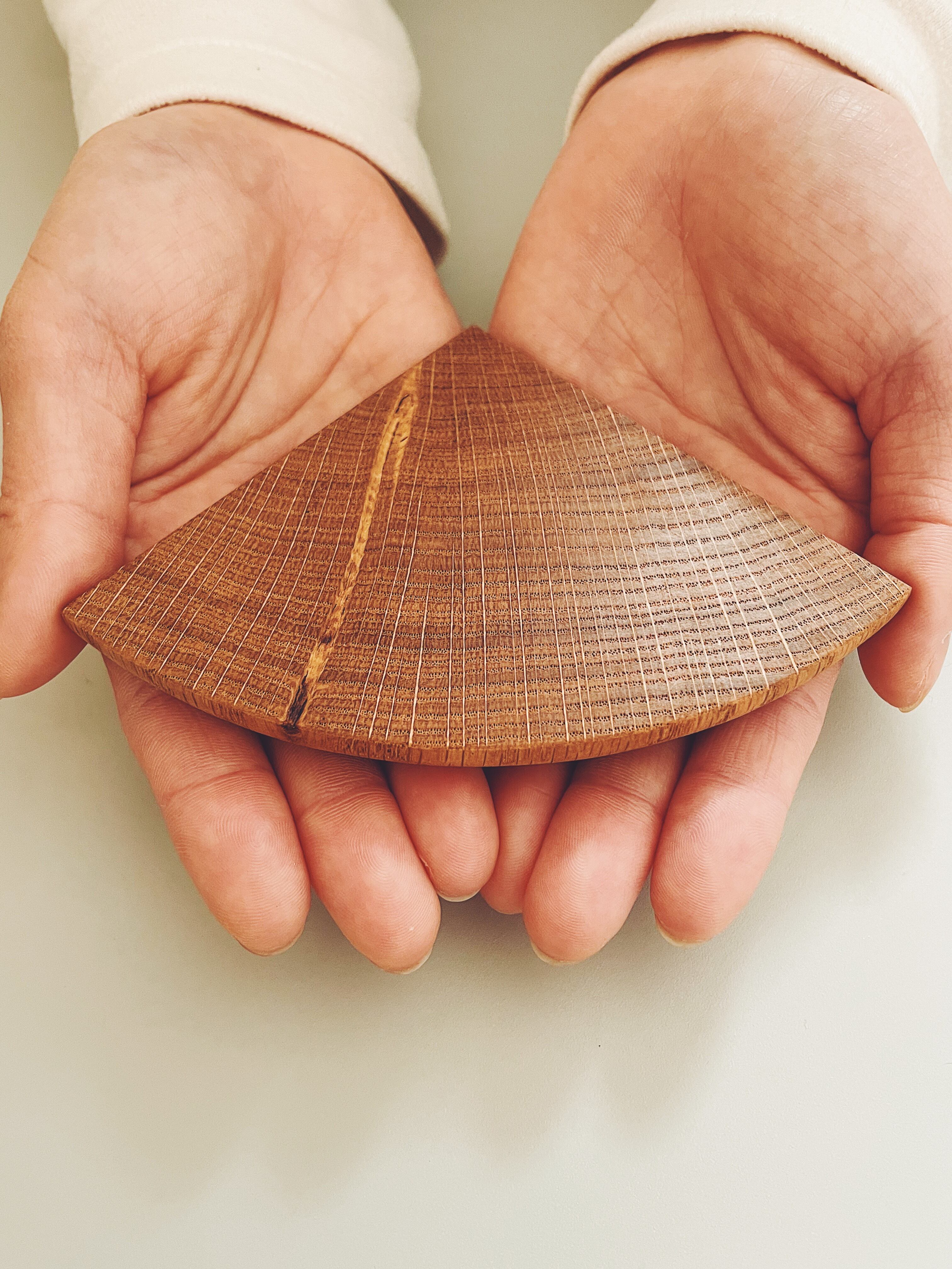 <Quarter Coaster> Size:W90×D90mm Material:Oak Finish:Oil Finish 円形の4分の1を切り取った、ありそうでなかった形のコースター。 4つ集めれば、鍋敷としても活躍します。 ※無垢材を使用している為、不規則に節や割れ荒木などが入ることがありますのであらかじめご了承下さい。 ※価格は1つ分です。